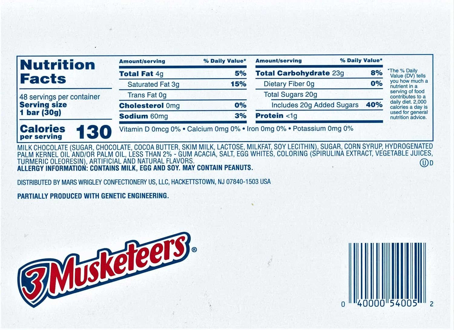 Contains one 1048 ounce bag of 3 MUSKETEERS Fun Size Chocolate Bars. The Daily Values numbers on the 3 Musketeers Bar nutrition label above are based on a 2000 calorie diet. 85 2300 g left.
